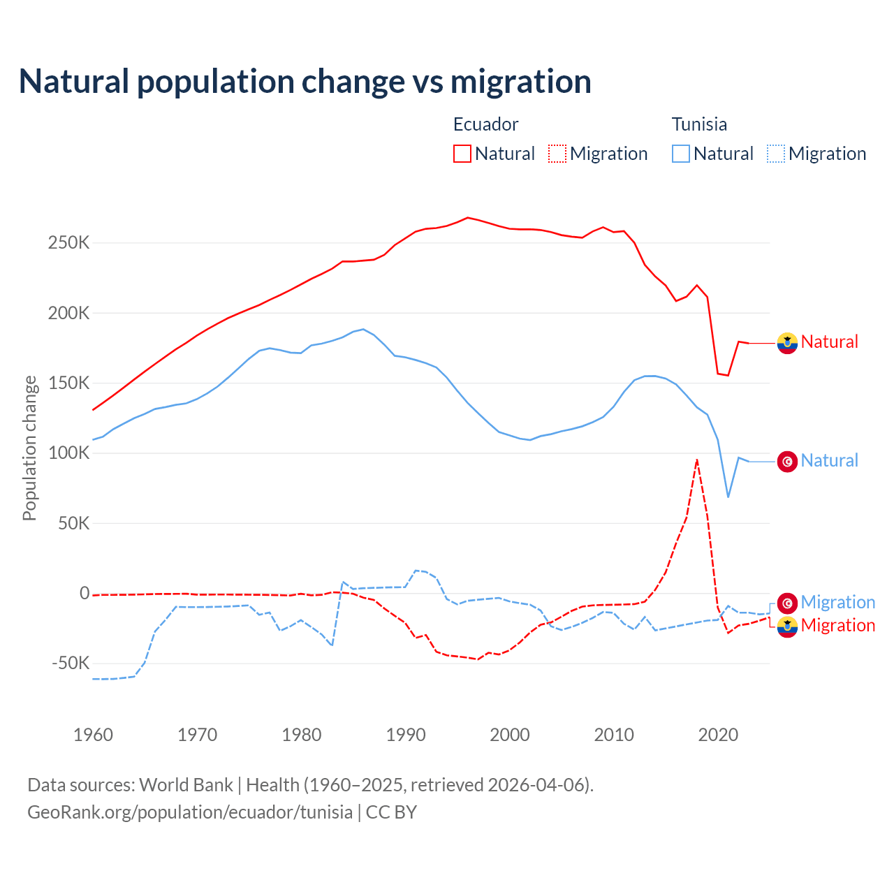 Over the last 10 years, 91.9% of the population change in Ecuador is from natural causes (a gain of 1,964,352 people) and 8.08% is from migration (a gain of 172,707 people). In Tunisia 86.3% is from natural causes (a gain of 1,225,079 people) and 13.7% is from migration (a loss of 195,011 people).