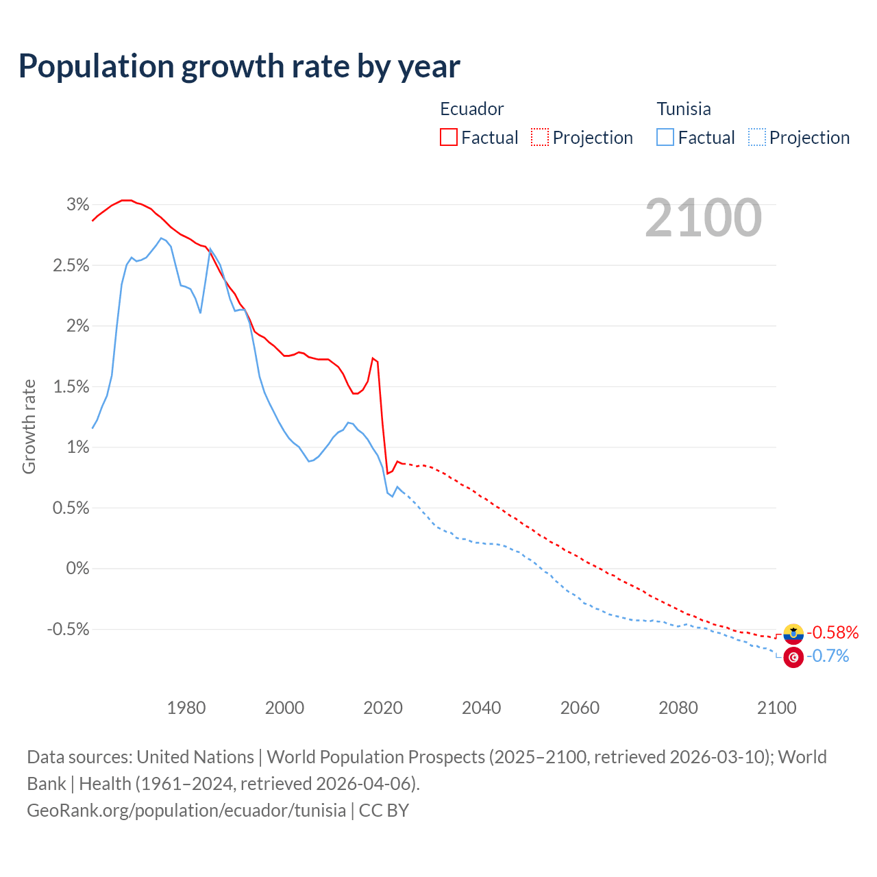- For the last 10 years, Ecuador has had an average growth rate of +1.26% per year vs +0.89% in Tunisia.