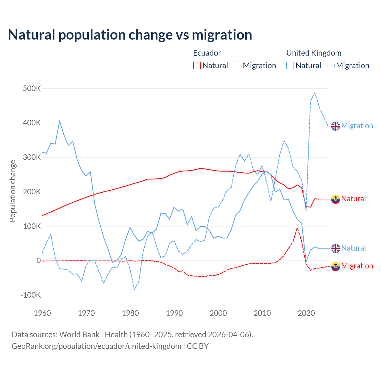 Over the last 10 years, 91.9% of the population change in Ecuador is from natural causes (a gain of 1,964,352 people) and 8.08% is from migration (a gain of 172,707 people). In the United Kingdom 23.9% is from natural causes (a gain of 1,033,129 people) and 76.1% is from migration (a gain of 3,283,101 people).