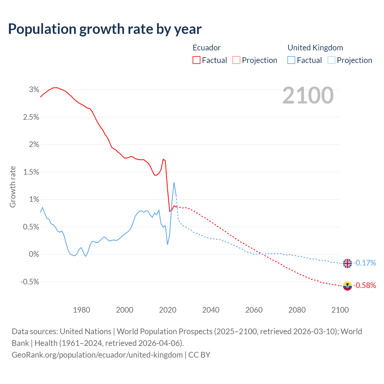 - For the last 10 years, Ecuador has had an average growth rate of +1.26% per year vs +0.7% in the United Kingdom.