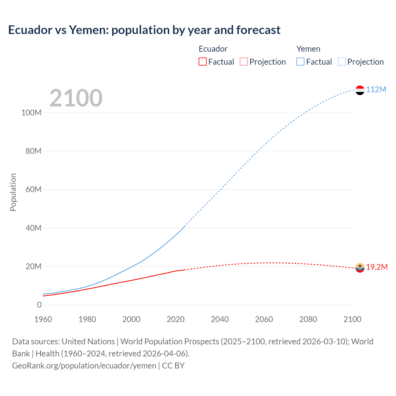 The latest officially reported population of Ecuador was 18,135,478 in 2024 vs 40,583,164 people in Yemen in 2024. In 2026, based on the adjusted UN estimation, the current Ecuador's population is 18,487,749 people compared to 43,325,643 in Yemen.
