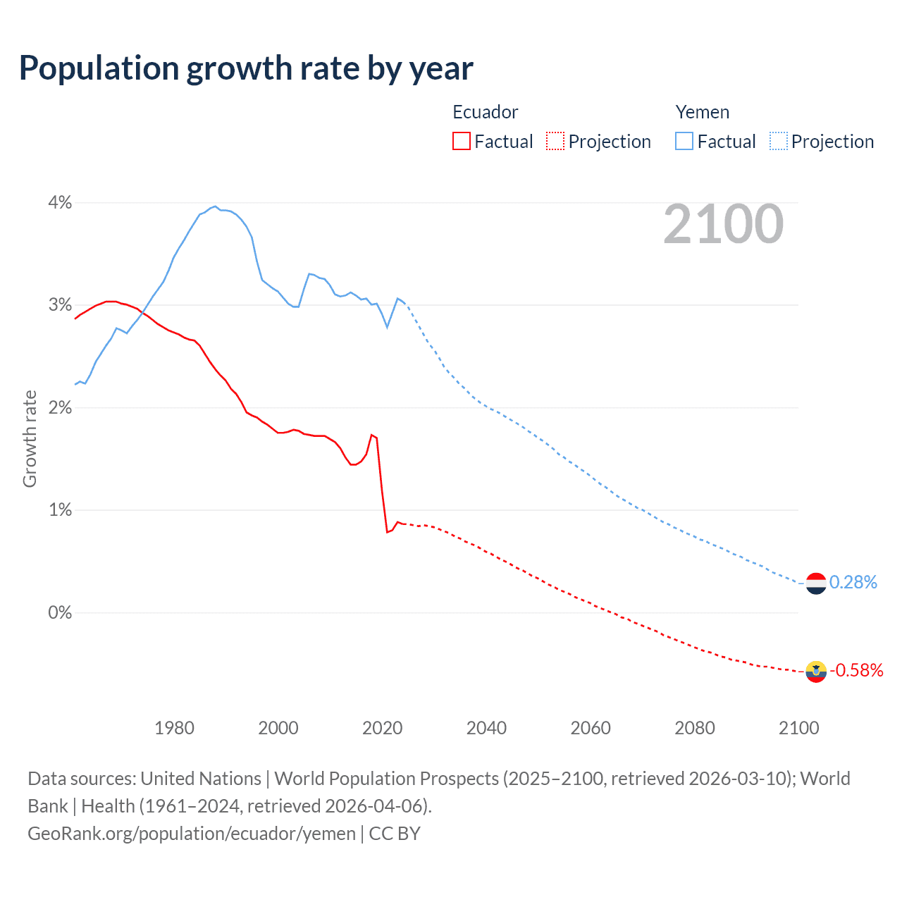 - For the last 10 years, Ecuador has had an average growth rate of +1.26% per year vs +3% in Yemen.