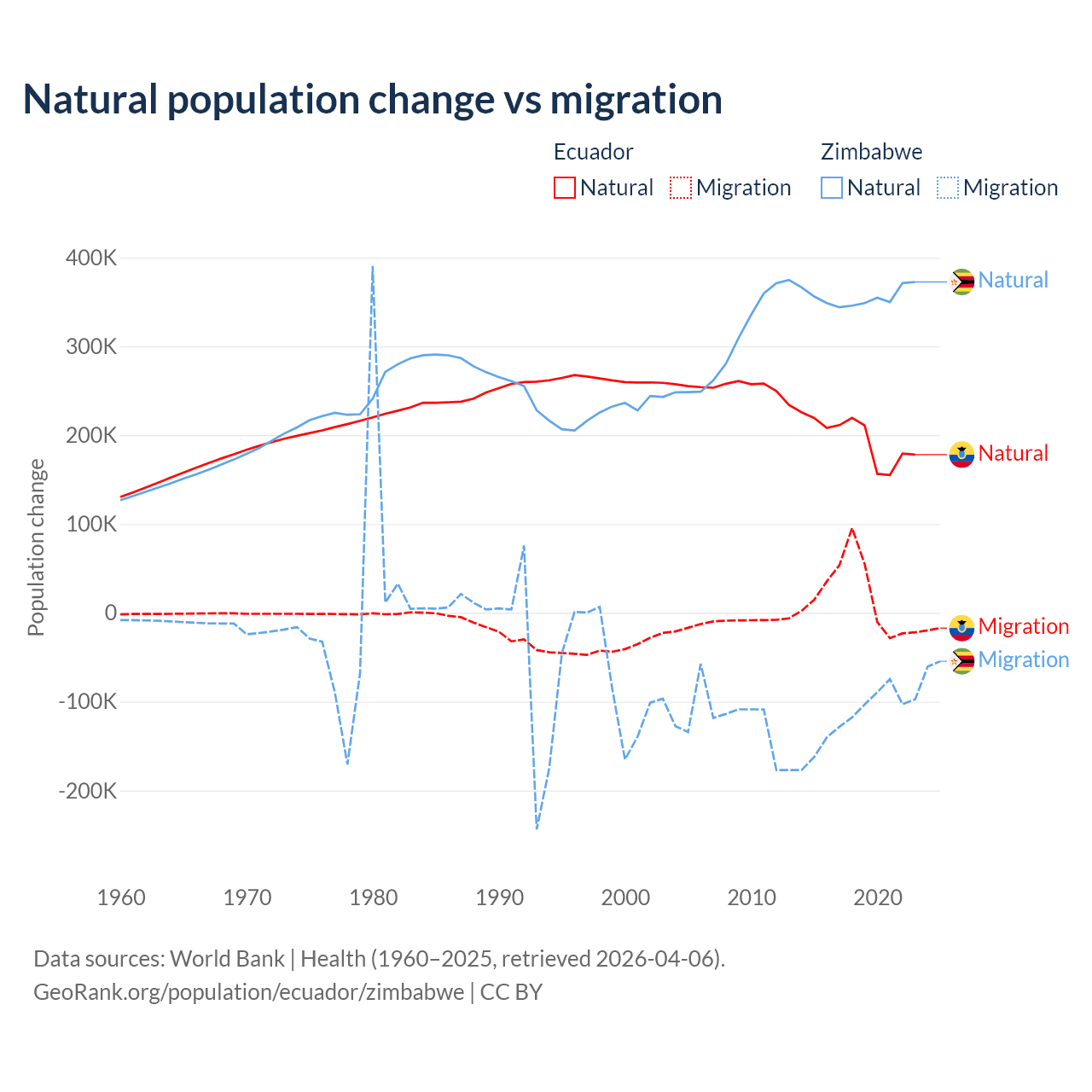 Over the last 10 years, 91.9% of the population change in Ecuador is from natural causes (a gain of 1,964,352 people) and 8.08% is from migration (a gain of 172,707 people). In Zimbabwe 74.9% is from natural causes (a gain of 3,558,487 people) and 25.1% is from migration (a loss of 1,192,807 people).