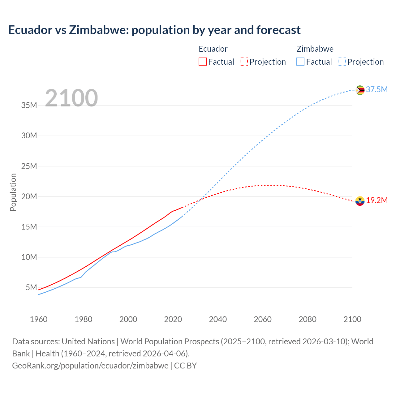 The latest officially reported population of Ecuador was 18,135,478 in 2024 vs 16,634,373 people in Zimbabwe in 2024. In 2026, based on the adjusted UN estimation, the current Ecuador's population is 18,487,749 people compared to 17,361,868 in Zimbabwe.