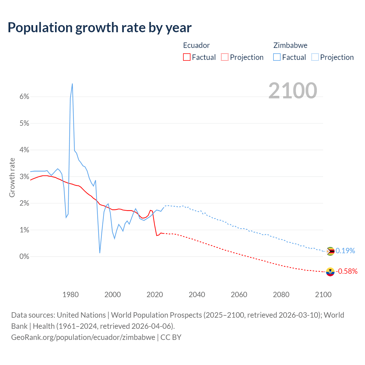 - For the last 10 years, Ecuador has had an average growth rate of +1.26% per year vs +1.57% in Zimbabwe.