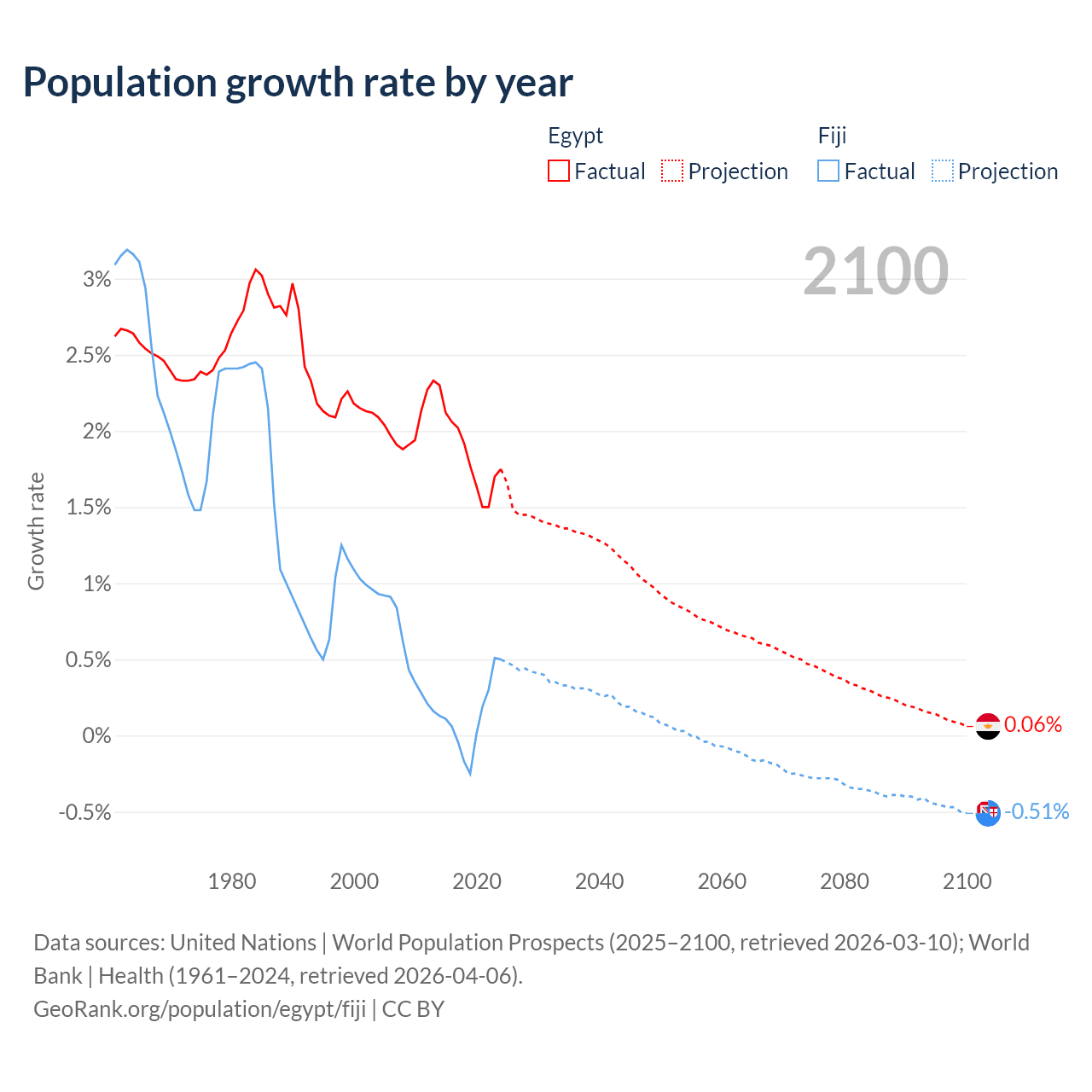 - For the last 10 years, Egypt has had an average growth rate of +1.84% per year vs +0.12% in Fiji.