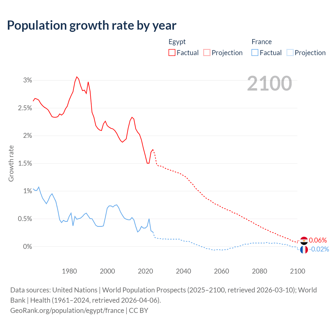 - For the last 10 years, Egypt has had an average growth rate of +1.84% per year vs +0.35% in France.