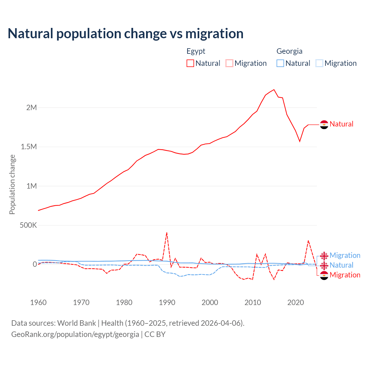 Over the last 10 years, 99.6% of the population change in Egypt is from natural causes (a gain of 19,180,073 people) and 0.41% is from migration (a loss of 78,975 people). In Georgia 57.7% is from natural causes (a gain of 47,646 people) and 42.3% is from migration (a loss of 34,907 people).
