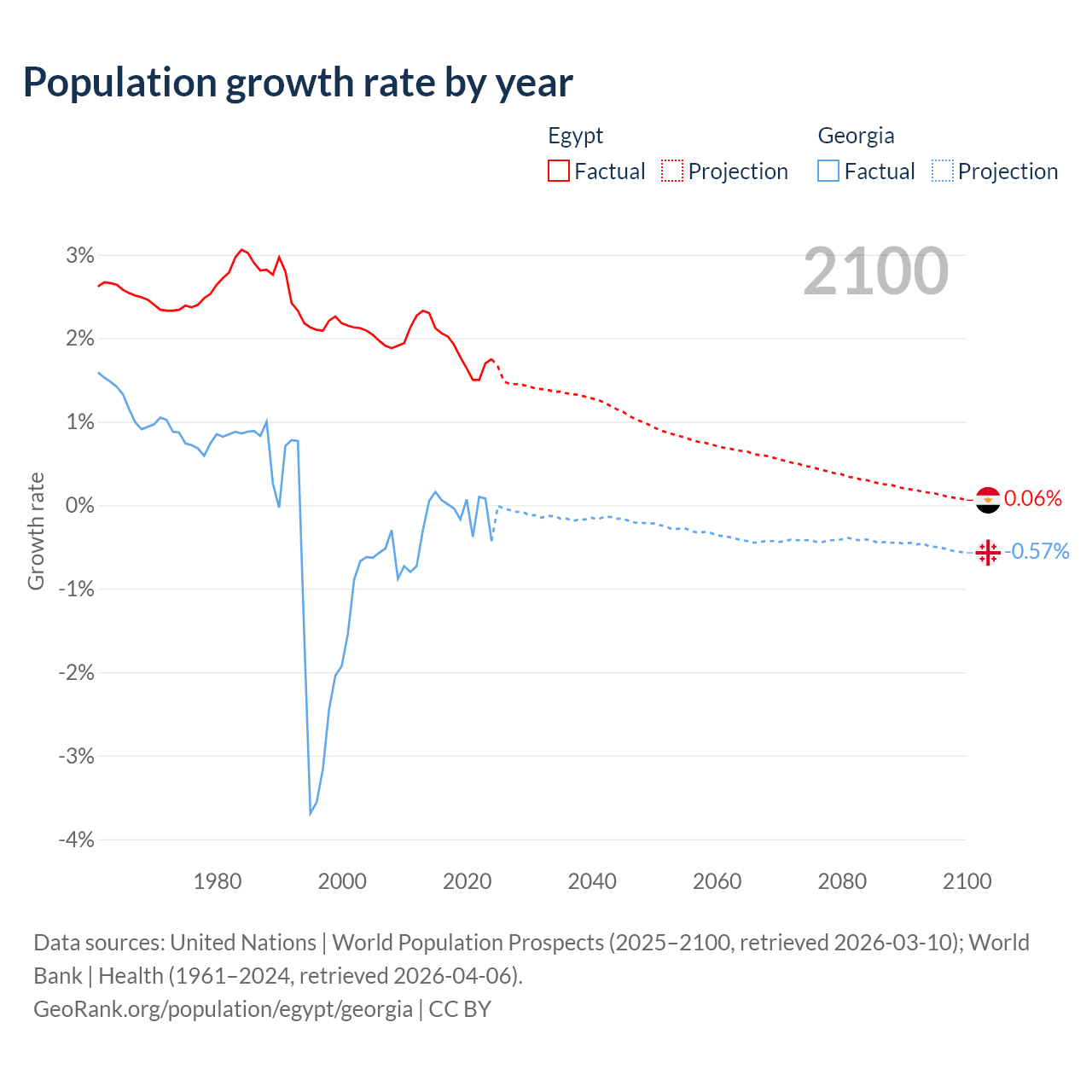 - For the last 10 years, Egypt has had an average growth rate of +1.84% per year vs -0.04% in Georgia.