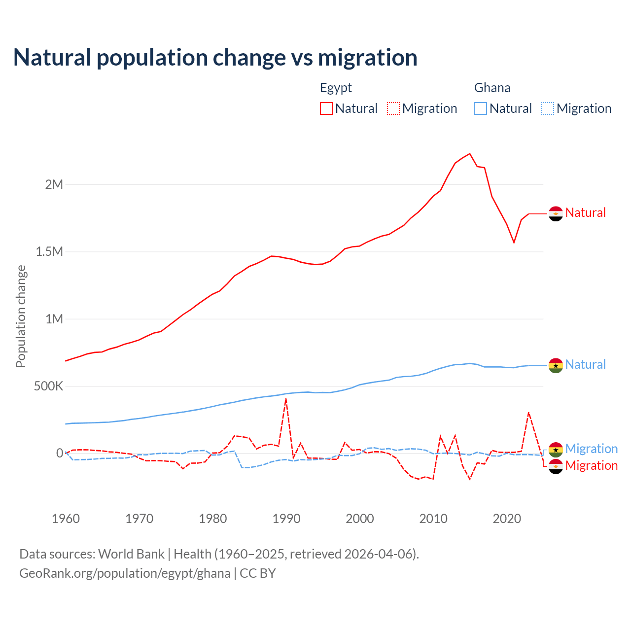 Over the last 10 years, 99.6% of the population change in Egypt is from natural causes (a gain of 19,180,073 people) and 0.41% is from migration (a loss of 78,975 people). In Ghana 98.6% is from natural causes (a gain of 6,484,449 people) and 1.37% is from migration (a loss of 90,310 people).