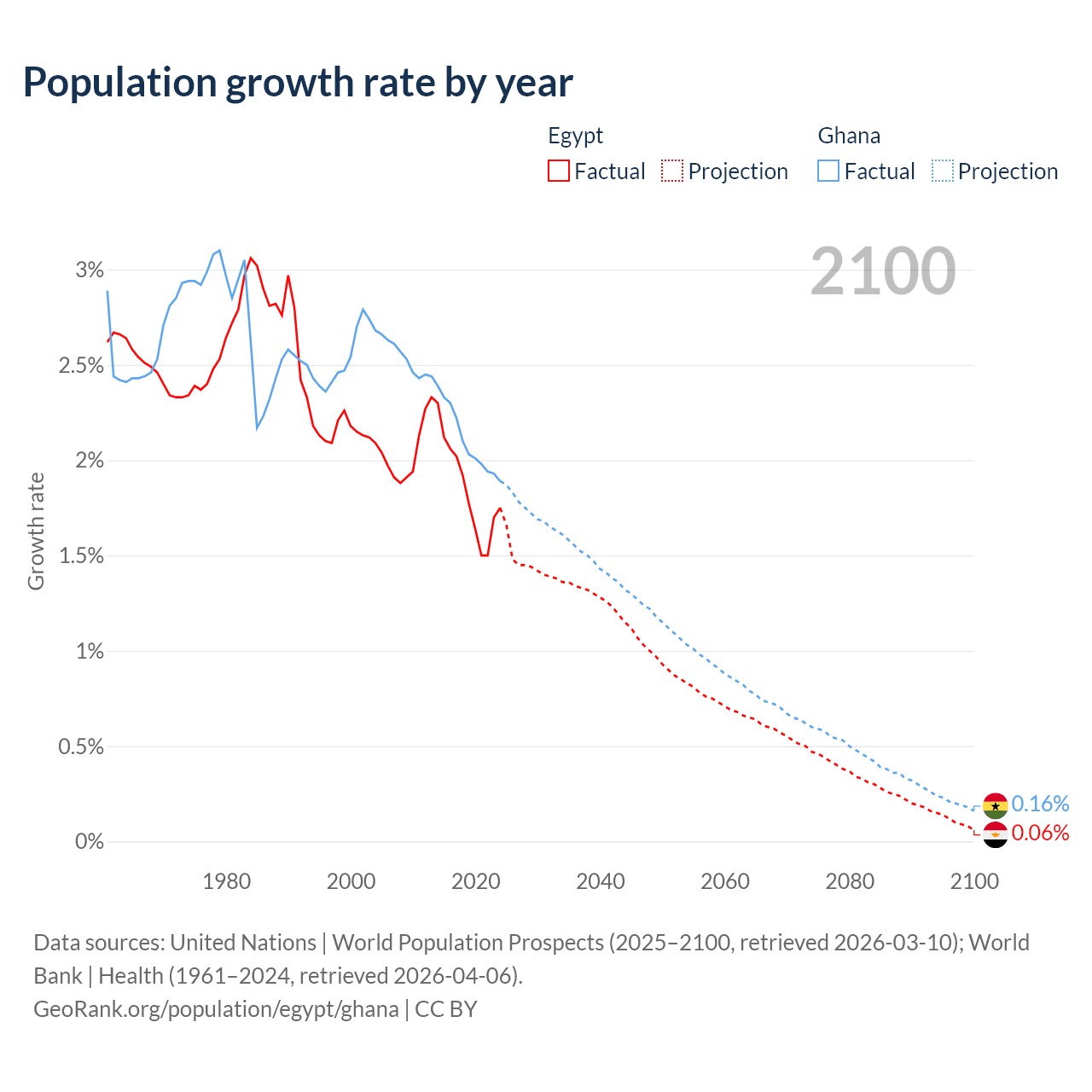 - For the last 10 years, Egypt has had an average growth rate of +1.84% per year vs +2.1% in Ghana.