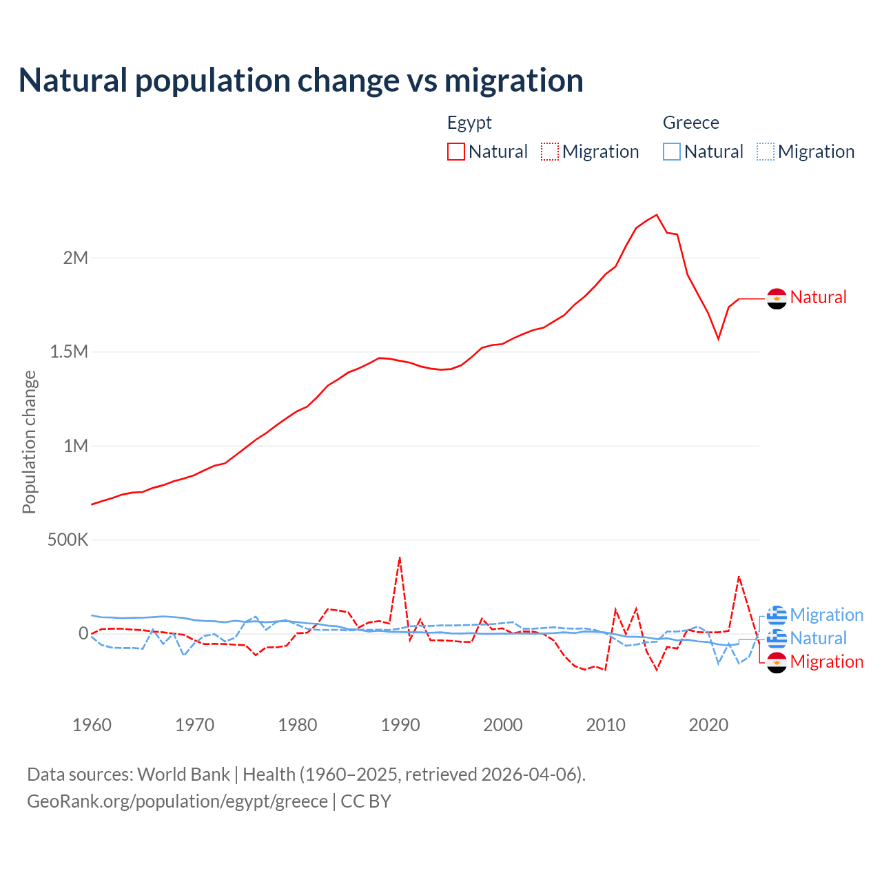 Over the last 10 years, 99.6% of the population change in Egypt is from natural causes (a gain of 19,180,073 people) and 0.41% is from migration (a loss of 78,975 people). In Greece 51.9% is from natural causes (a loss of 411,426 people) and 48.1% is from migration (a loss of 381,824 people).