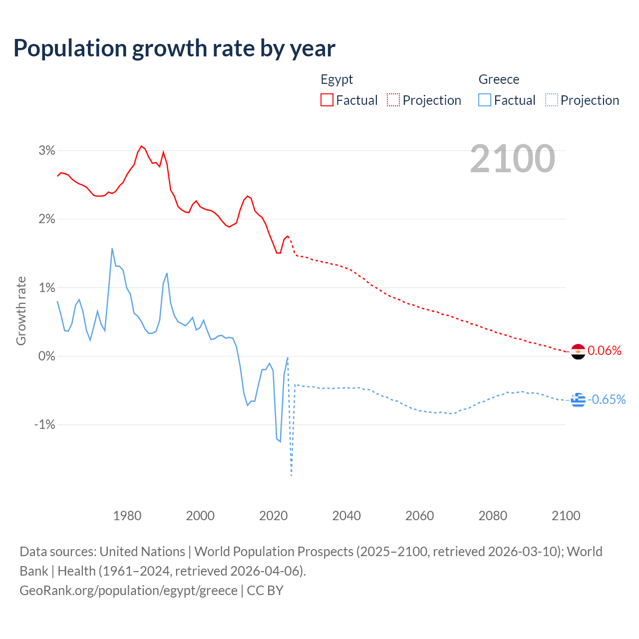 - For the last 10 years, Egypt has had an average growth rate of +1.84% per year vs -0.47% in Greece.