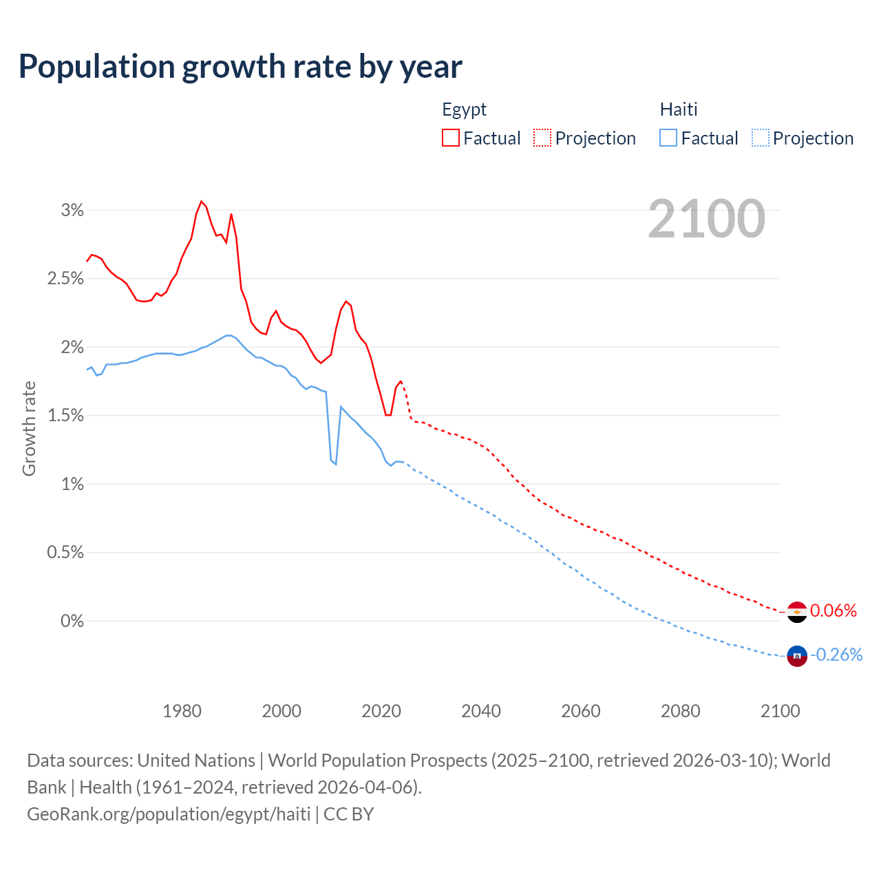 - For the last 10 years, Egypt has had an average growth rate of +1.84% per year vs +1.29% in Haiti.