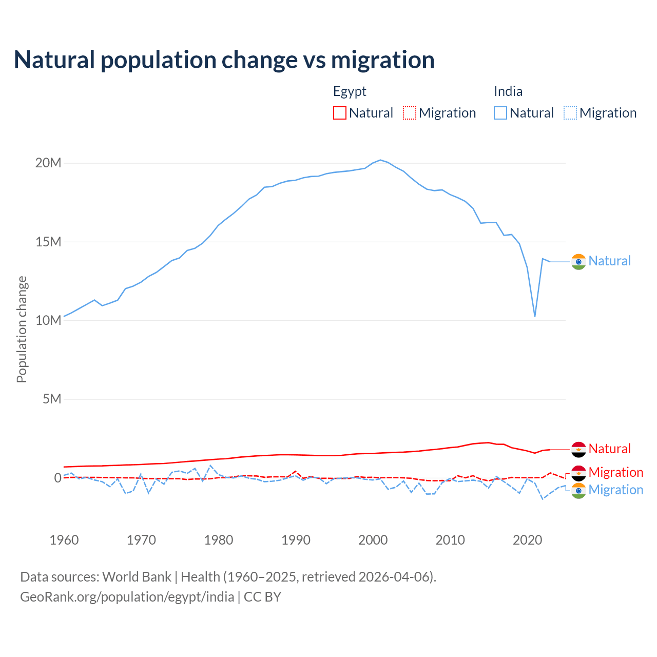 Over the last 10 years, 99.6% of the population change in Egypt is from natural causes (a gain of 19,180,073 people) and 0.41% is from migration (a loss of 78,975 people). In India 96.4% is from natural causes (a gain of 145,503,378 people) and 3.56% is from migration (a loss of 5,376,884 people).