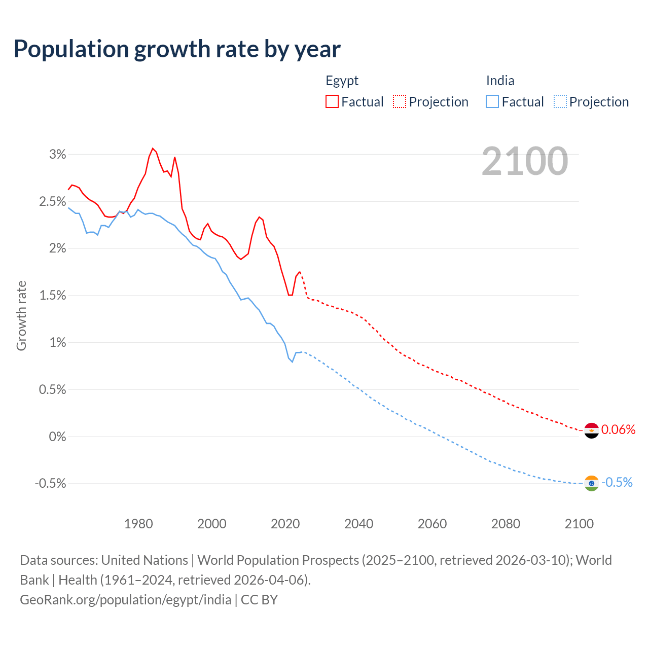 - For the last 10 years, Egypt has had an average growth rate of +1.84% per year vs +1.03% in India.