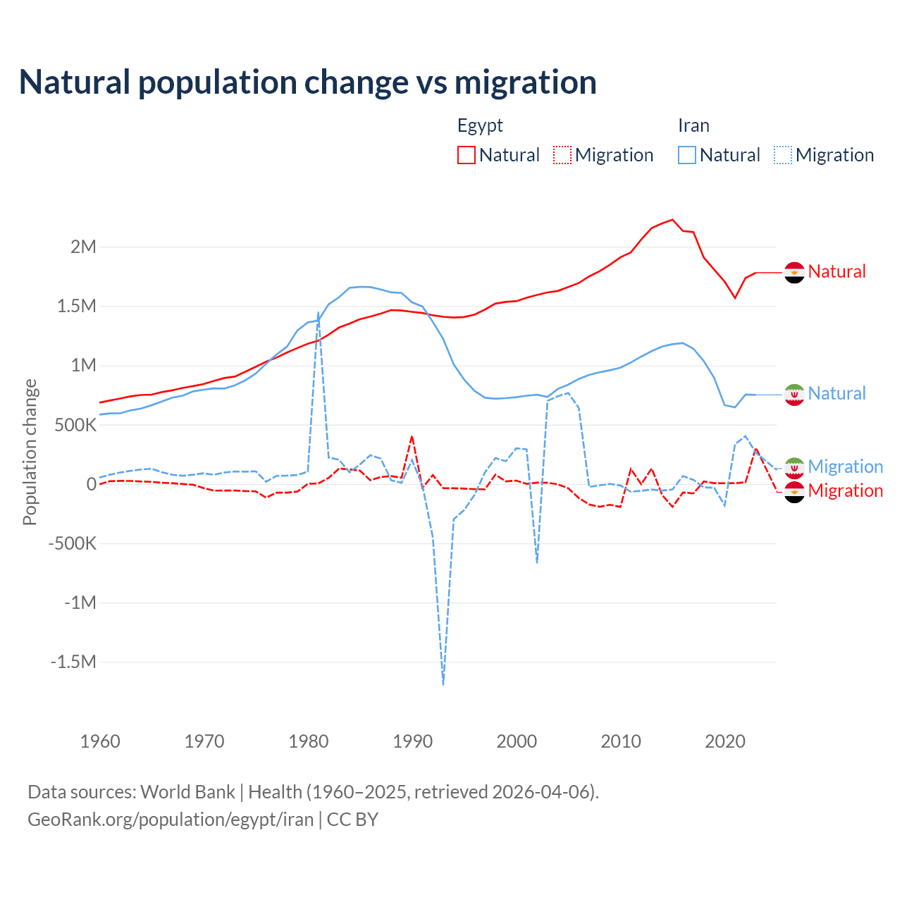 Over the last 10 years, 99.6% of the population change in Egypt is from natural causes (a gain of 19,180,073 people) and 0.41% is from migration (a loss of 78,975 people). In Iran 92.5% is from natural causes (a gain of 9,405,860 people) and 7.46% is from migration (a gain of 757,979 people).
