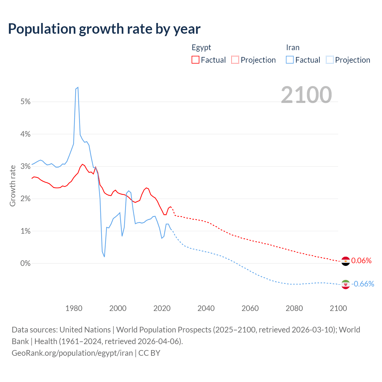 - For the last 10 years, Egypt has had an average growth rate of +1.84% per year vs +1.19% in Iran.