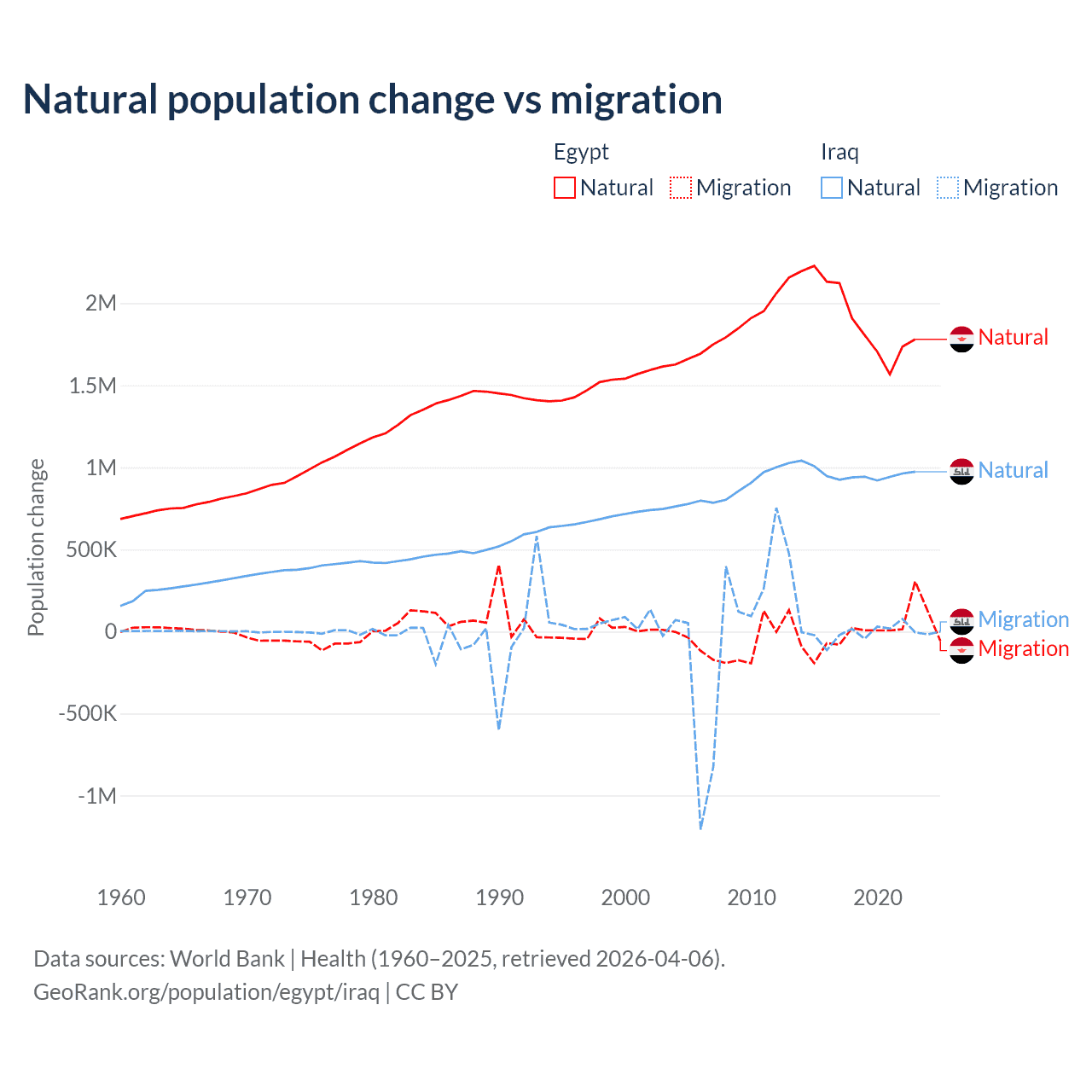 Over the last 10 years, 99.6% of the population change in Egypt is from natural causes (a gain of 19,180,073 people) and 0.41% is from migration (a loss of 78,975 people). In Iraq 99.2% is from natural causes (a gain of 9,598,842 people) and 0.76% is from migration (a loss of 73,050 people).