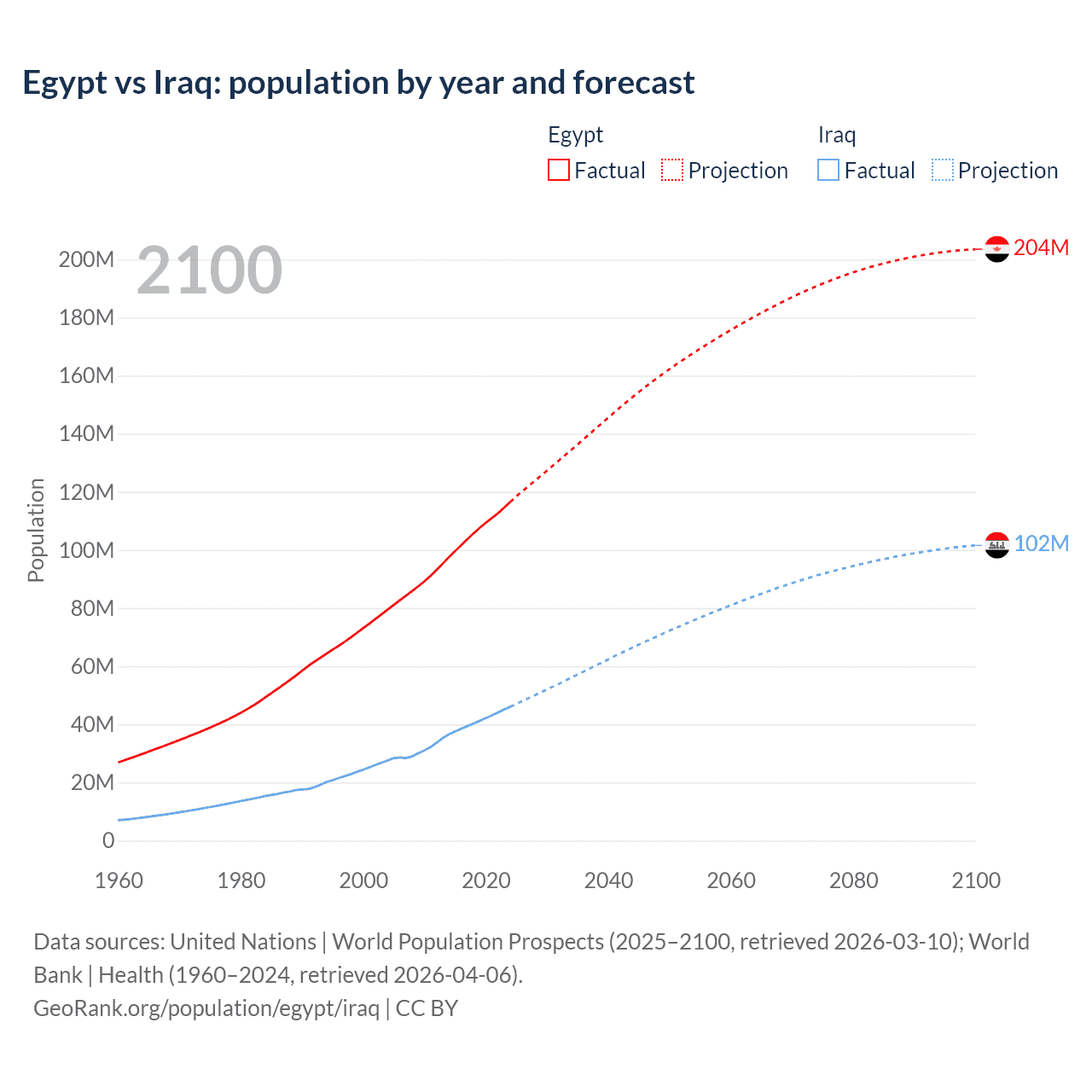 The latest officially reported population of Egypt was 116,538,258 in 2024 vs 46,042,015 people in Iraq in 2024. In 2026, based on the adjusted UN estimation, the current Egypt's population is 120,697,176 people compared to 48,289,334 in Iraq.