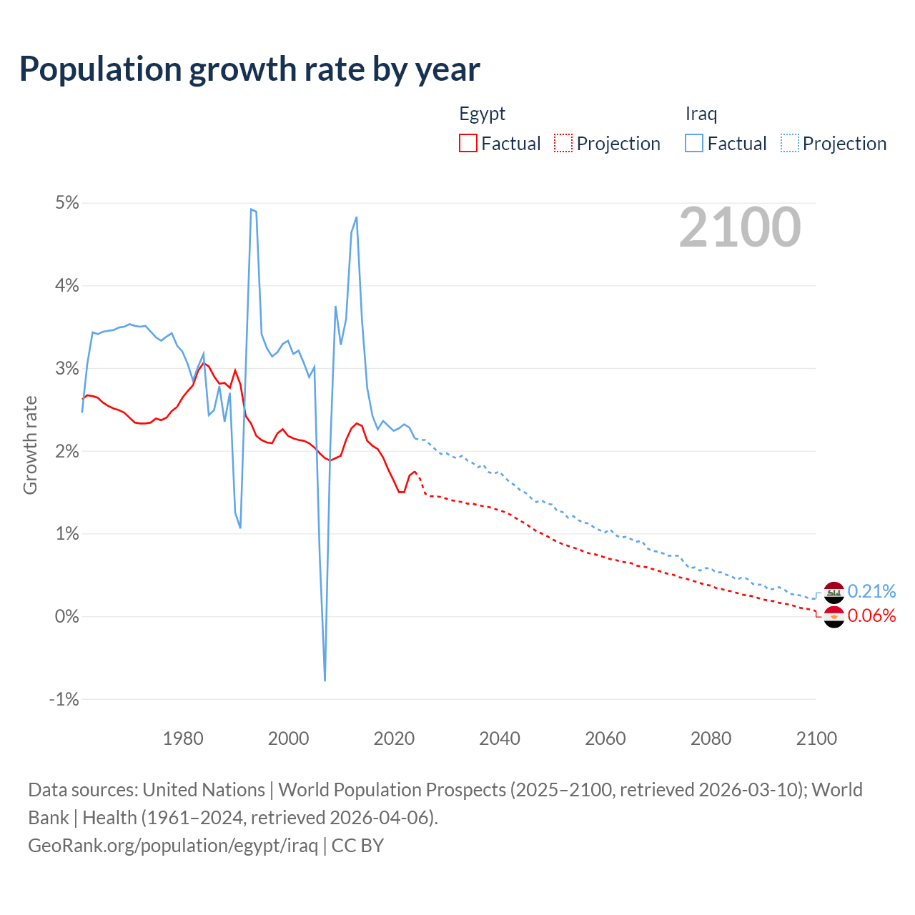 - For the last 10 years, Egypt has had an average growth rate of +1.84% per year vs +2.45% in Iraq.