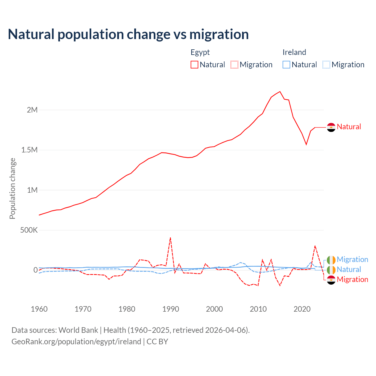 Over the last 10 years, 99.6% of the population change in Egypt is from natural causes (a gain of 19,180,073 people) and 0.41% is from migration (a loss of 78,975 people). In Ireland 48.2% is from natural causes (a gain of 284,644 people) and 51.8% is from migration (a gain of 305,297 people).