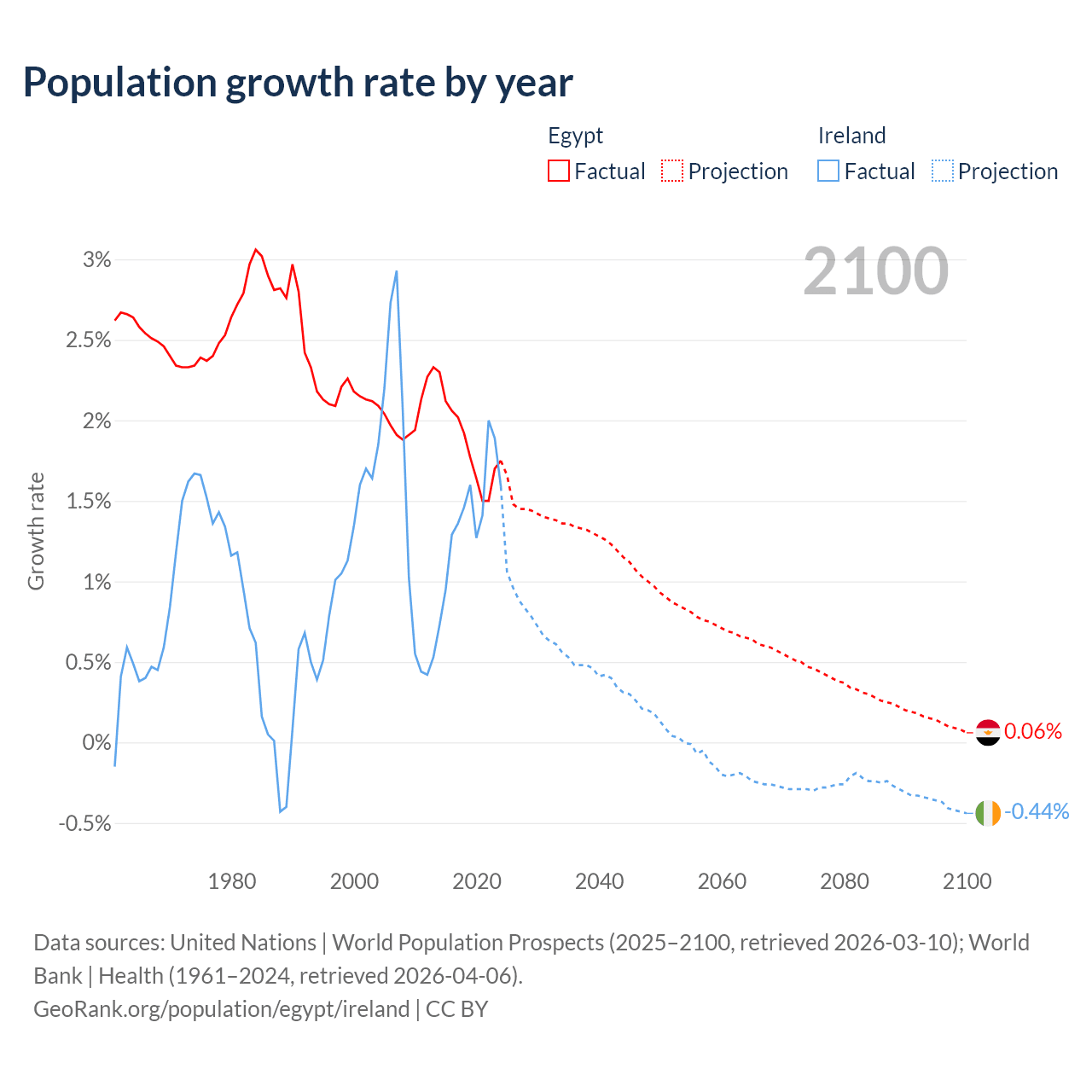- For the last 10 years, Egypt has had an average growth rate of +1.84% per year vs +1.41% in Ireland.