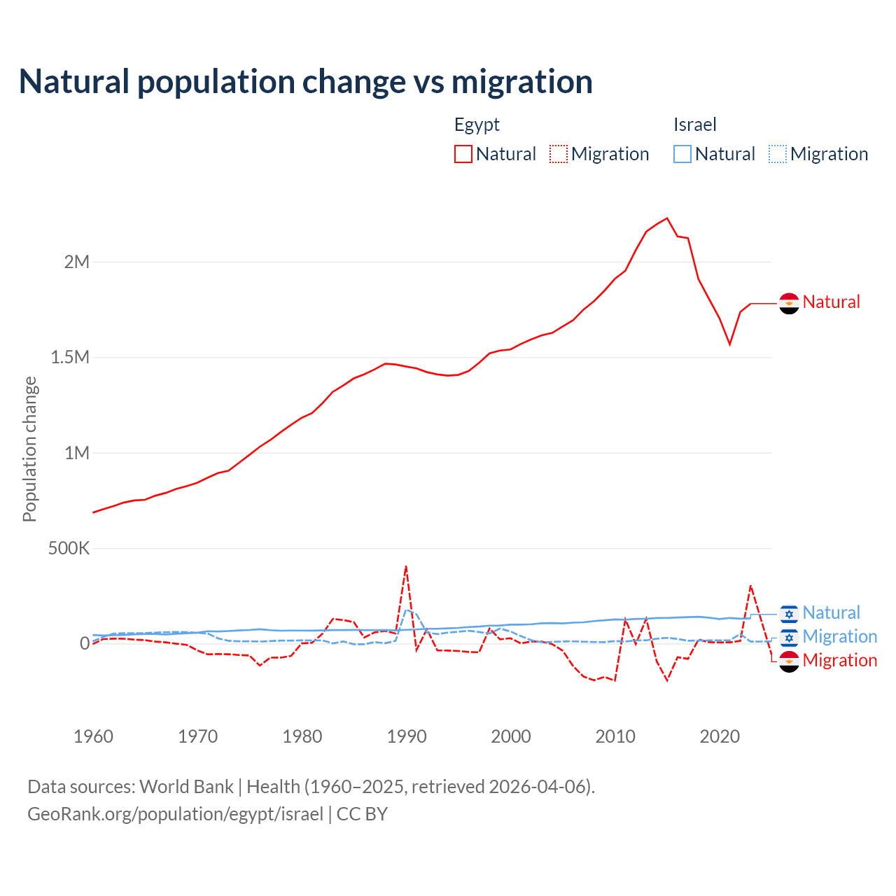 Over the last 10 years, 99.6% of the population change in Egypt is from natural causes (a gain of 19,180,073 people) and 0.41% is from migration (a loss of 78,975 people). In Israel 86% is from natural causes (a gain of 1,343,492 people) and 14% is from migration (a gain of 219,048 people).