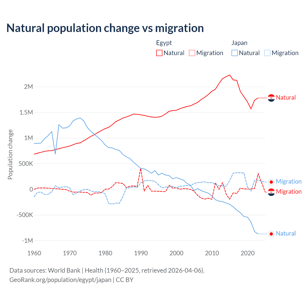Over the last 10 years, 99.6% of the population change in Egypt is from natural causes (a gain of 19,180,073 people) and 0.41% is from migration (a loss of 78,975 people). In Japan 73.6% is from natural causes (a loss of 5,178,838 people) and 26.4% is from migration (a gain of 1,860,103 people).