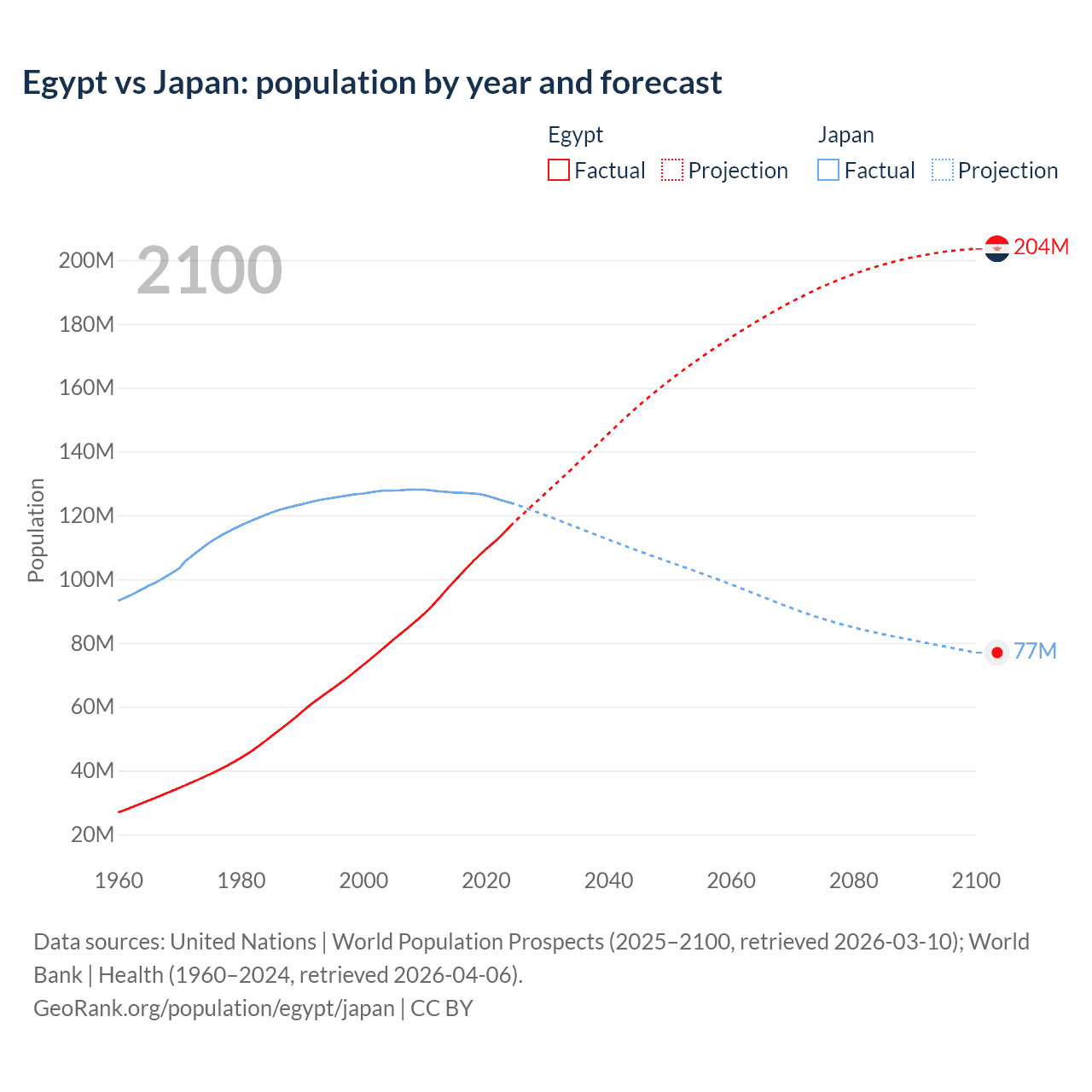 Egypt vs Japan: population by year and forecast