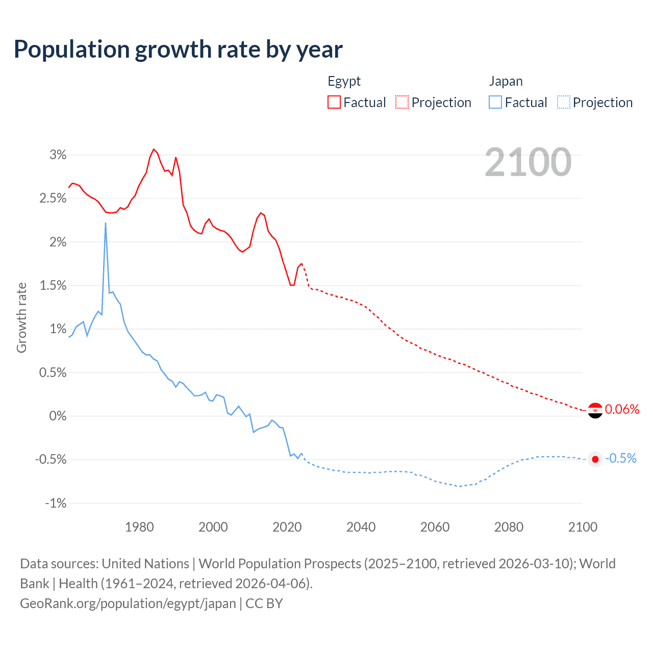 - For the last 10 years, Egypt has had an average growth rate of +1.84% per year vs -0.25% in Japan.