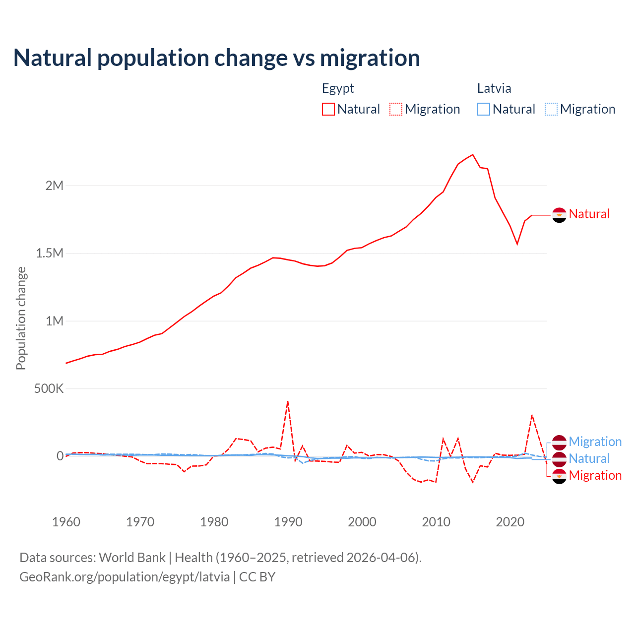 Over the last 10 years, 99.6% of the population change in Egypt is from natural causes (a gain of 19,180,073 people) and 0.41% is from migration (a loss of 78,975 people). In Latvia 82.7% is from natural causes (a loss of 103,711 people) and 17.3% is from migration (a loss of 21,641 people).