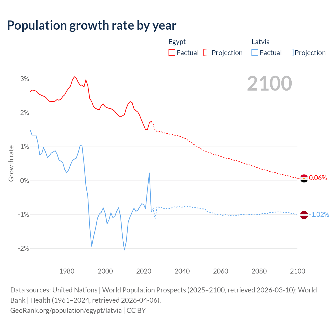 - For the last 10 years, Egypt has had an average growth rate of +1.84% per year vs -0.68% in Latvia.