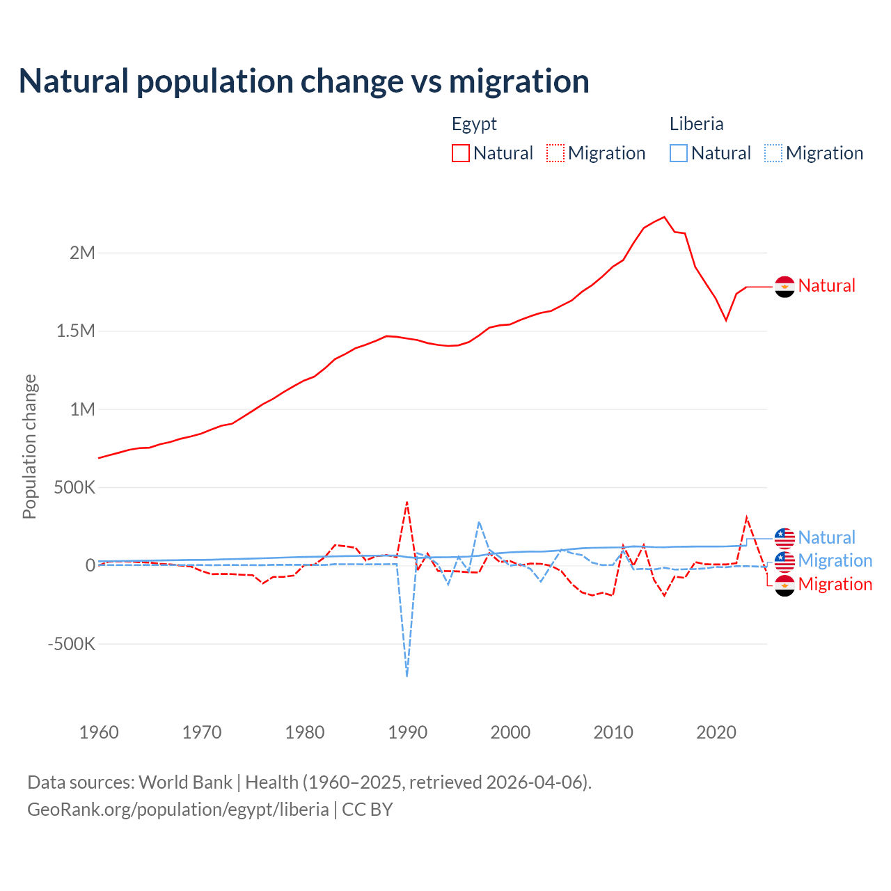 Over the last 10 years, 99.6% of the population change in Egypt is from natural causes (a gain of 19,180,073 people) and 0.41% is from migration (a loss of 78,975 people). In Liberia 87.7% is from natural causes (a gain of 1,202,387 people) and 12.3% is from migration (a loss of 168,316 people).