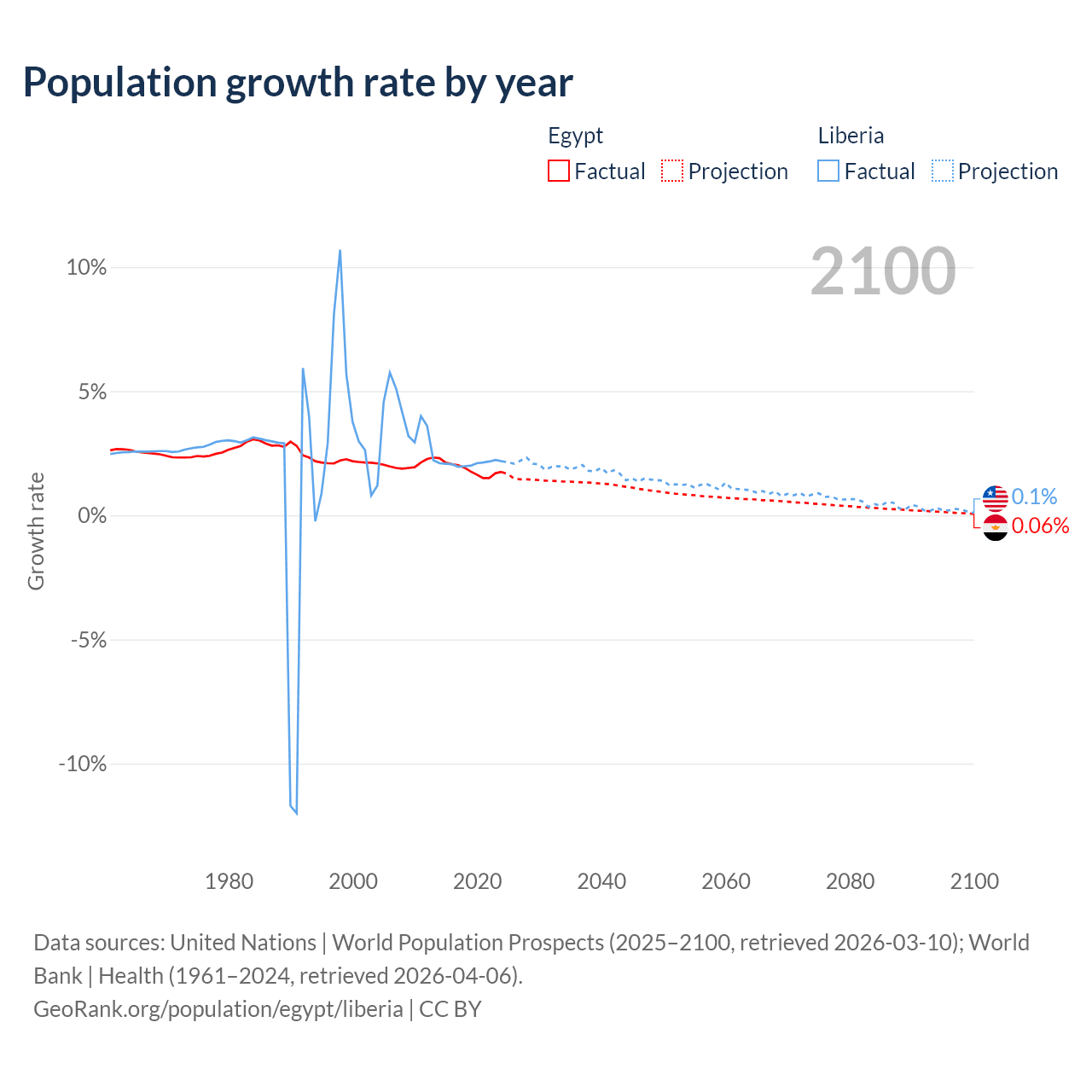 - For the last 10 years, Egypt has had an average growth rate of +1.84% per year vs +2.09% in Liberia.