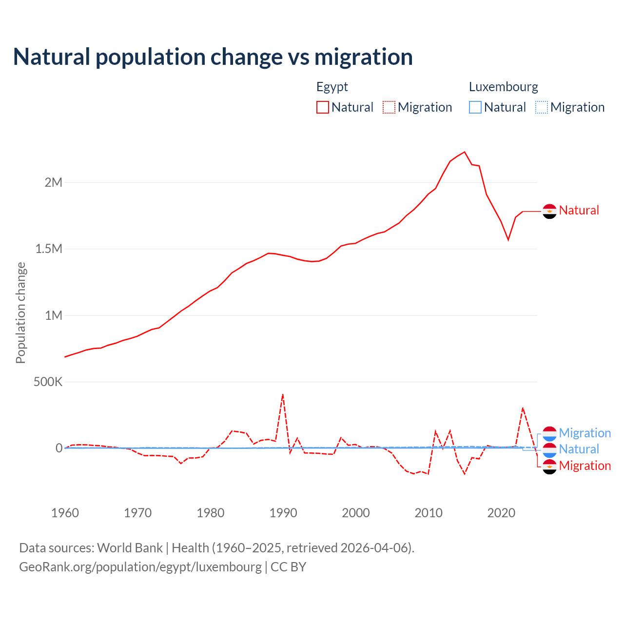 Over the last 10 years, 99.6% of the population change in Egypt is from natural causes (a gain of 19,180,073 people) and 0.41% is from migration (a loss of 78,975 people). In Luxembourg 16.8% is from natural causes (a gain of 20,287 people) and 83.2% is from migration (a gain of 100,435 people).