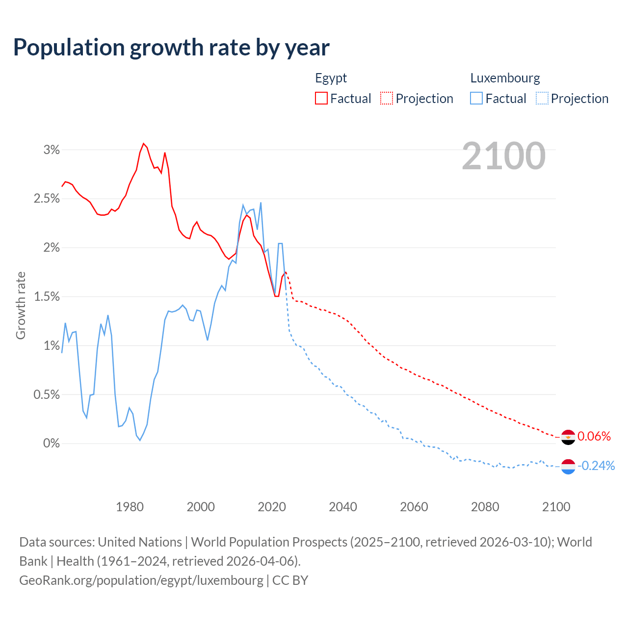 - For the last 10 years, Egypt has had an average growth rate of +1.84% per year vs +2.02% in Luxembourg.