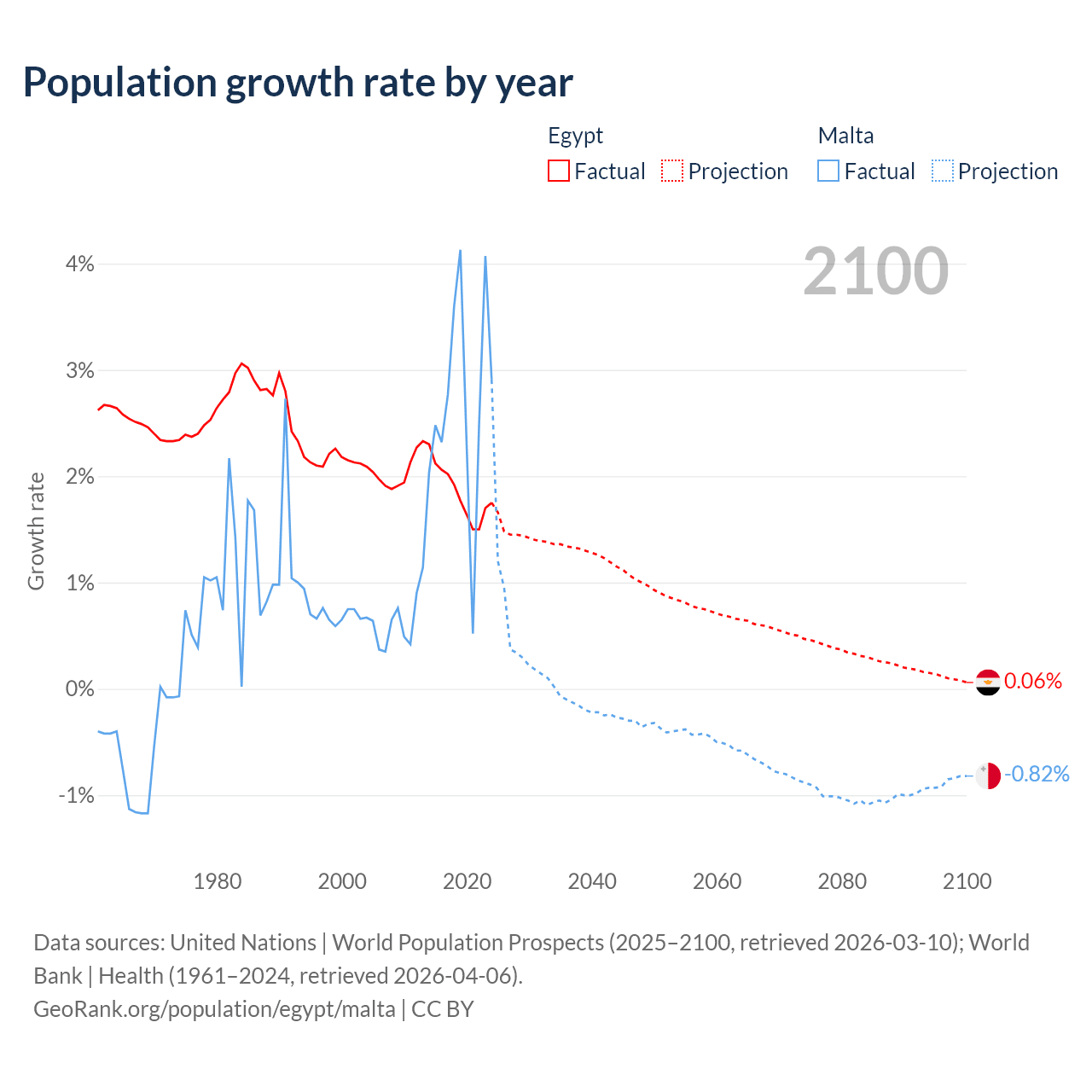 - For the last 10 years, Egypt has had an average growth rate of +1.84% per year vs +2.69% in Malta.