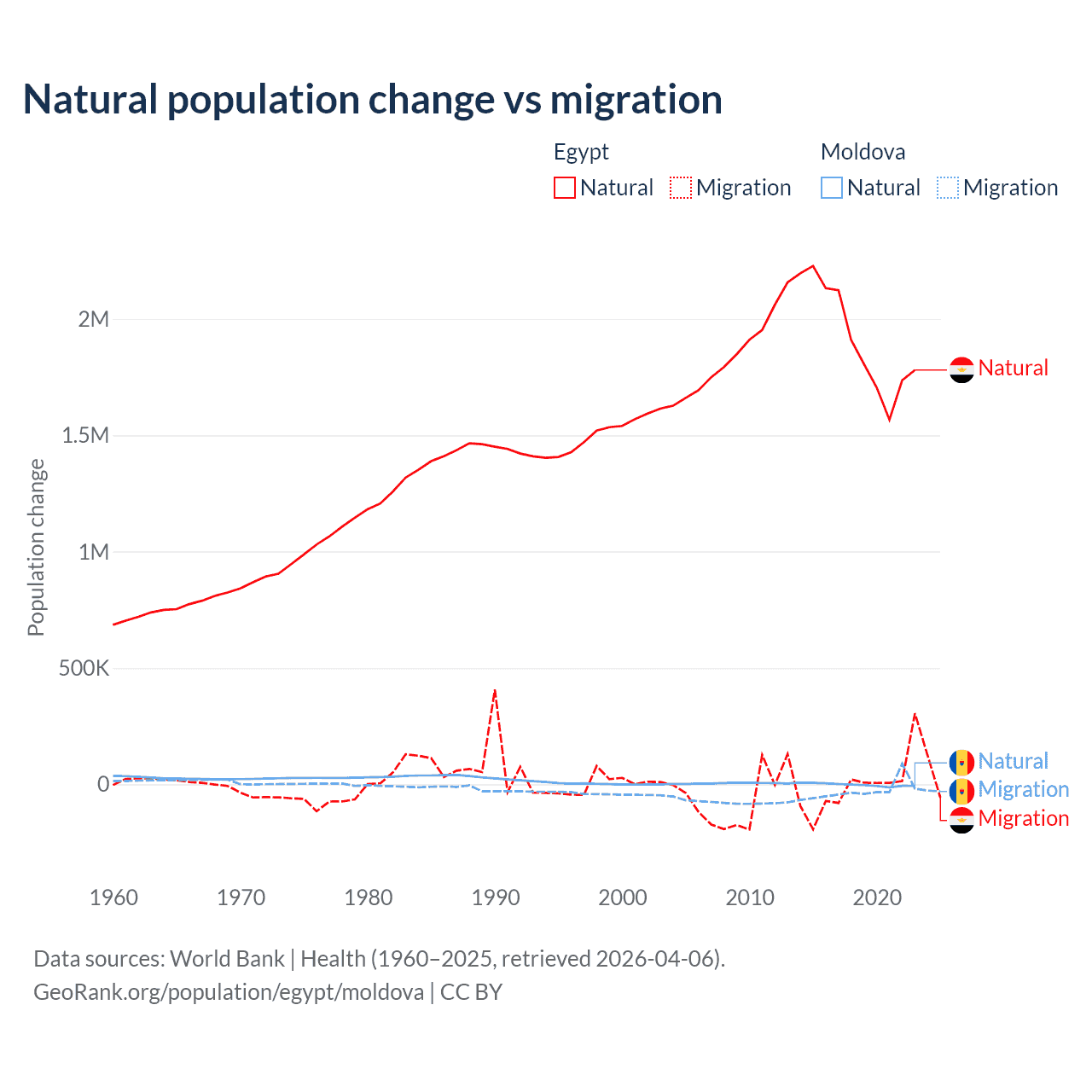 Over the last 10 years, 99.6% of the population change in Egypt is from natural causes (a gain of 19,180,073 people) and 0.41% is from migration (a loss of 78,975 people). In Moldova 6.04% is from natural causes (a loss of 19,001 people) and 94% is from migration (a loss of 295,631 people).