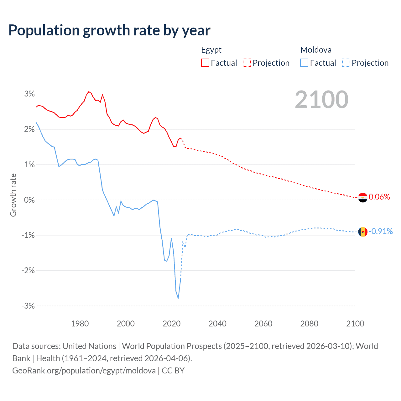 - For the last 10 years, Egypt has had an average growth rate of +1.84% per year vs -1.57% in Moldova.
