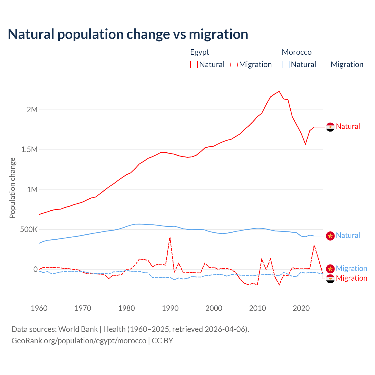 Over the last 10 years, 99.6% of the population change in Egypt is from natural causes (a gain of 19,180,073 people) and 0.41% is from migration (a loss of 78,975 people). In Morocco 88.3% is from natural causes (a gain of 4,495,223 people) and 11.7% is from migration (a loss of 594,083 people).