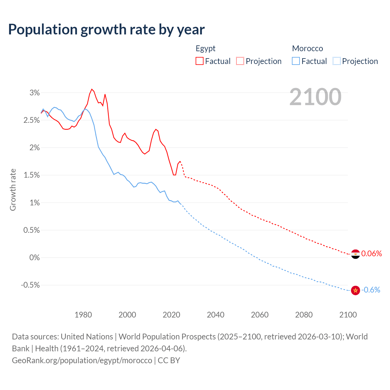 - For the last 10 years, Egypt has had an average growth rate of +1.84% per year vs +1.09% in Morocco.