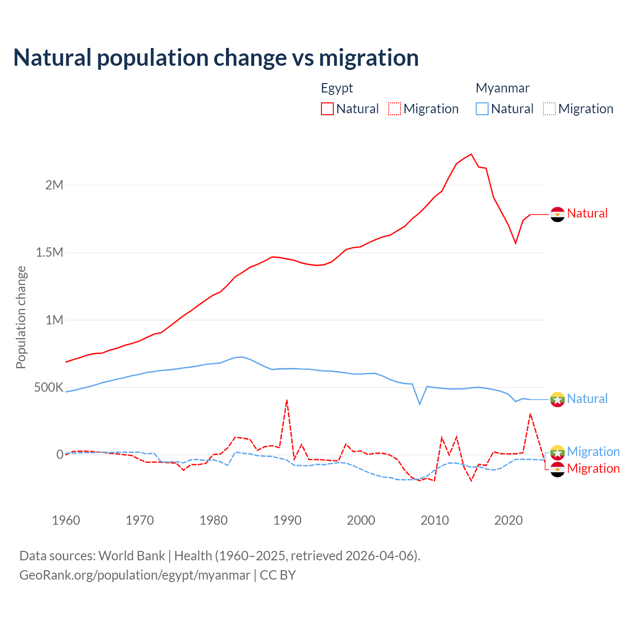 Over the last 10 years, 99.6% of the population change in Egypt is from natural causes (a gain of 19,180,073 people) and 0.41% is from migration (a loss of 78,975 people). In Myanmar 86% is from natural causes (a gain of 4,594,615 people) and 14% is from migration (a loss of 749,272 people).