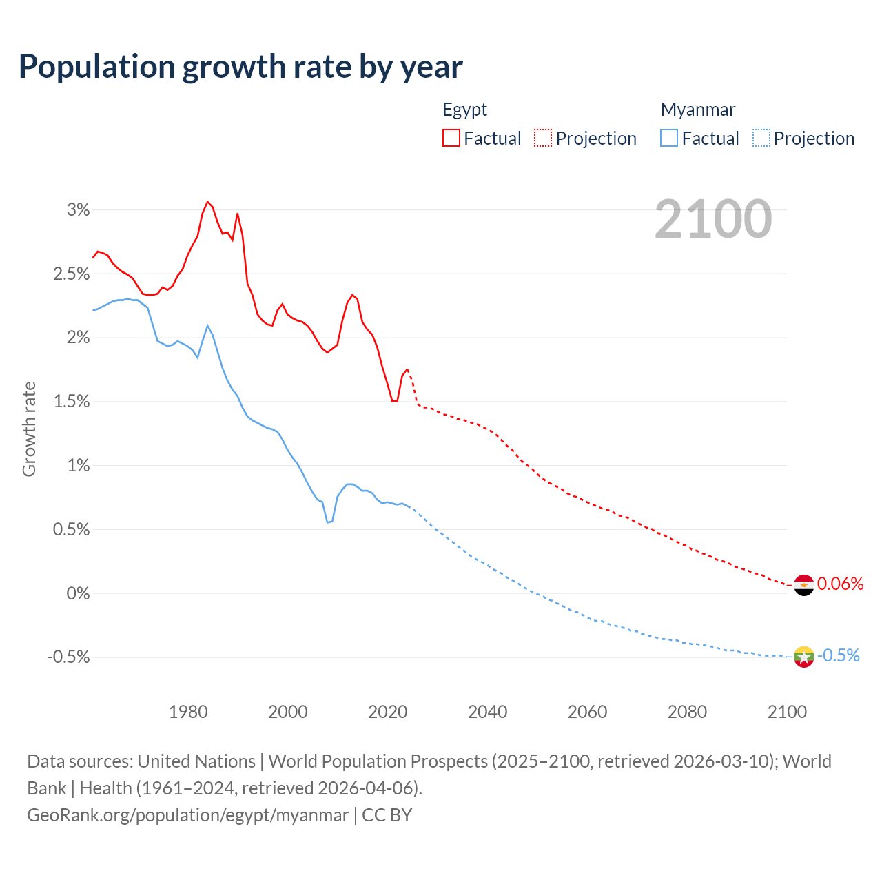 - For the last 10 years, Egypt has had an average growth rate of +1.84% per year vs +0.74% in Myanmar.