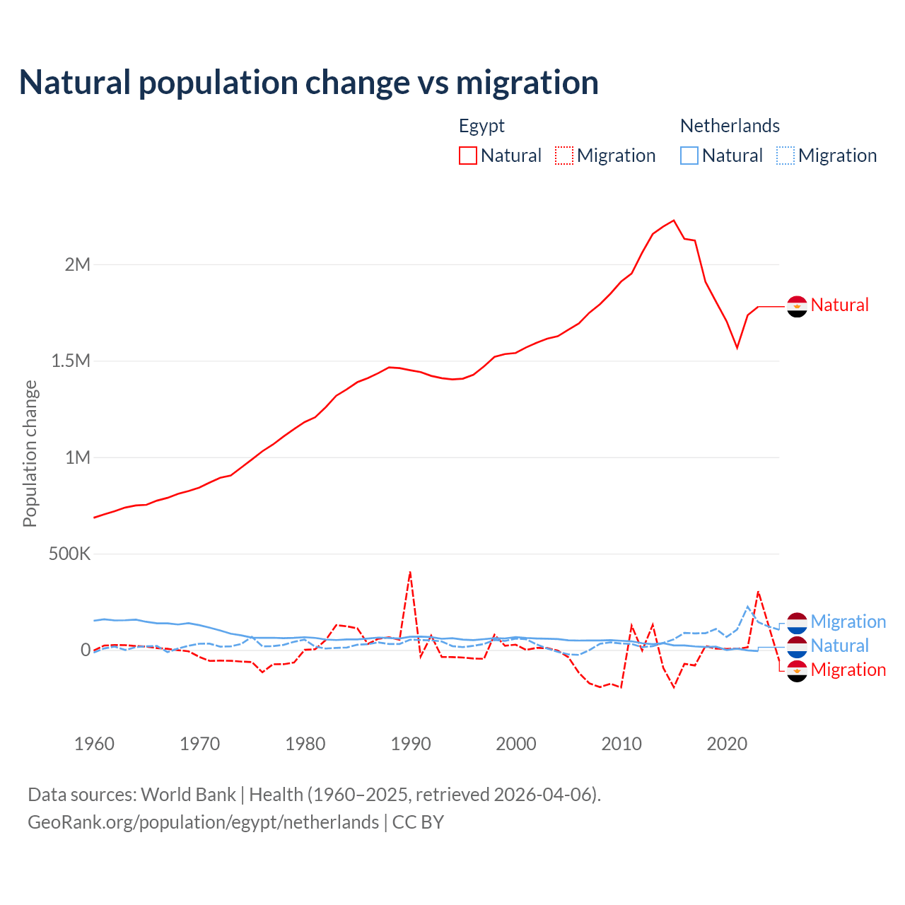Over the last 10 years, 99.6% of the population change in Egypt is from natural causes (a gain of 19,180,073 people) and 0.41% is from migration (a loss of 78,975 people). In the Netherlands 11.8% is from natural causes (a gain of 134,554 people) and 88.2% is from migration (a gain of 1,006,495 people).