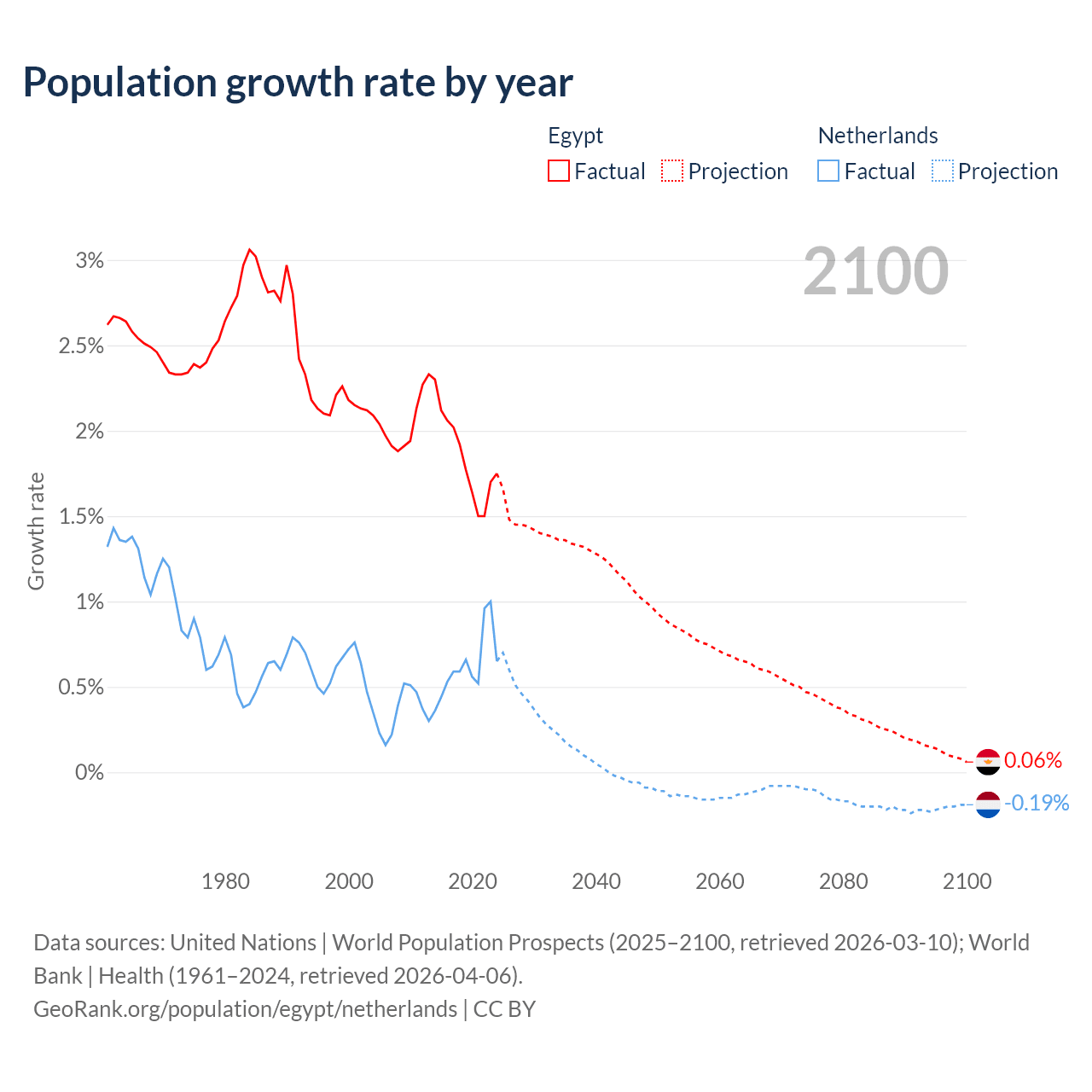 - For the last 10 years, Egypt has had an average growth rate of +1.84% per year vs +0.62% in the Netherlands.