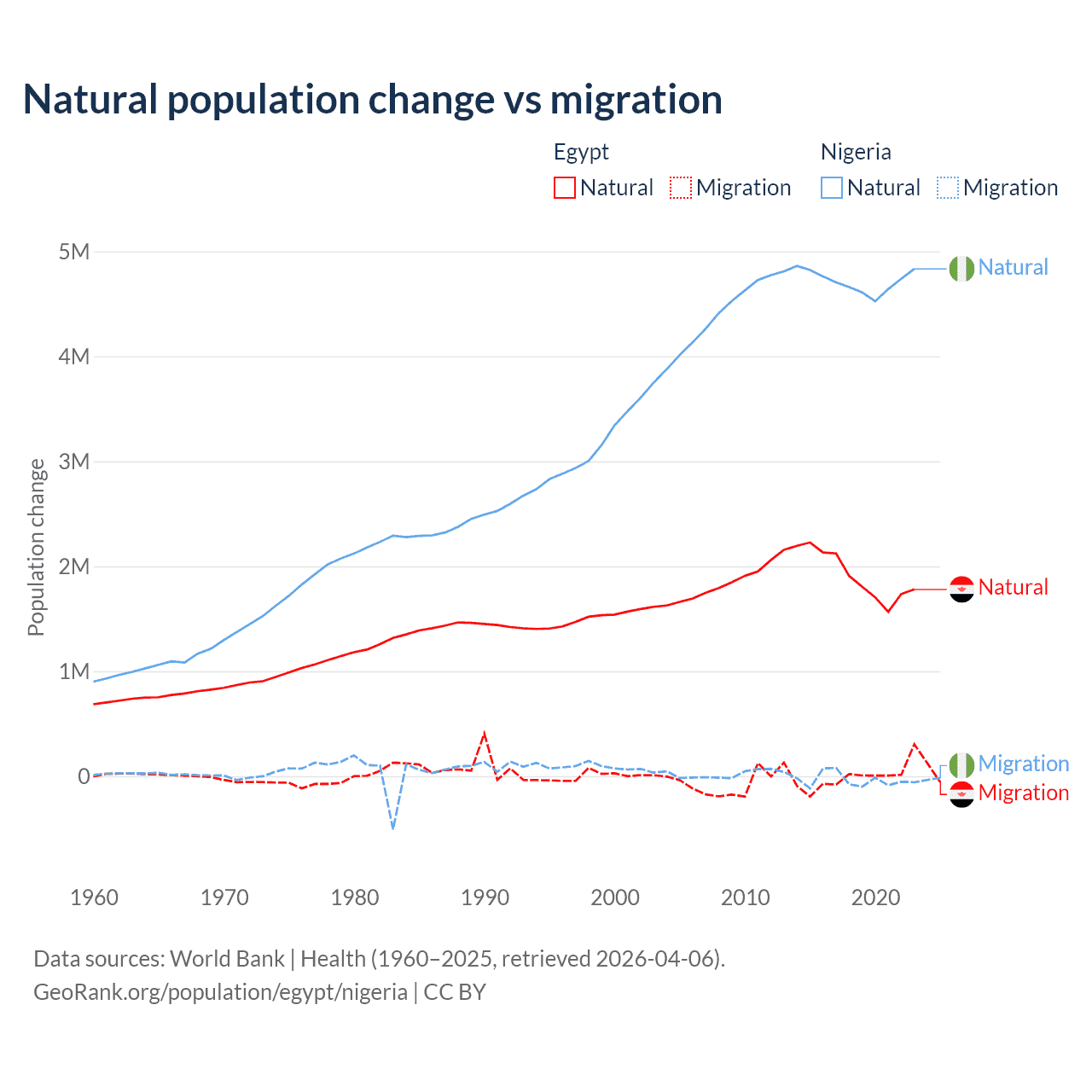Over the last 10 years, 99.6% of the population change in Egypt is from natural causes (a gain of 19,180,073 people) and 0.41% is from migration (a loss of 78,975 people). In Nigeria 99.2% is from natural causes (a gain of 47,163,517 people) and 0.77% is from migration (a loss of 368,103 people).