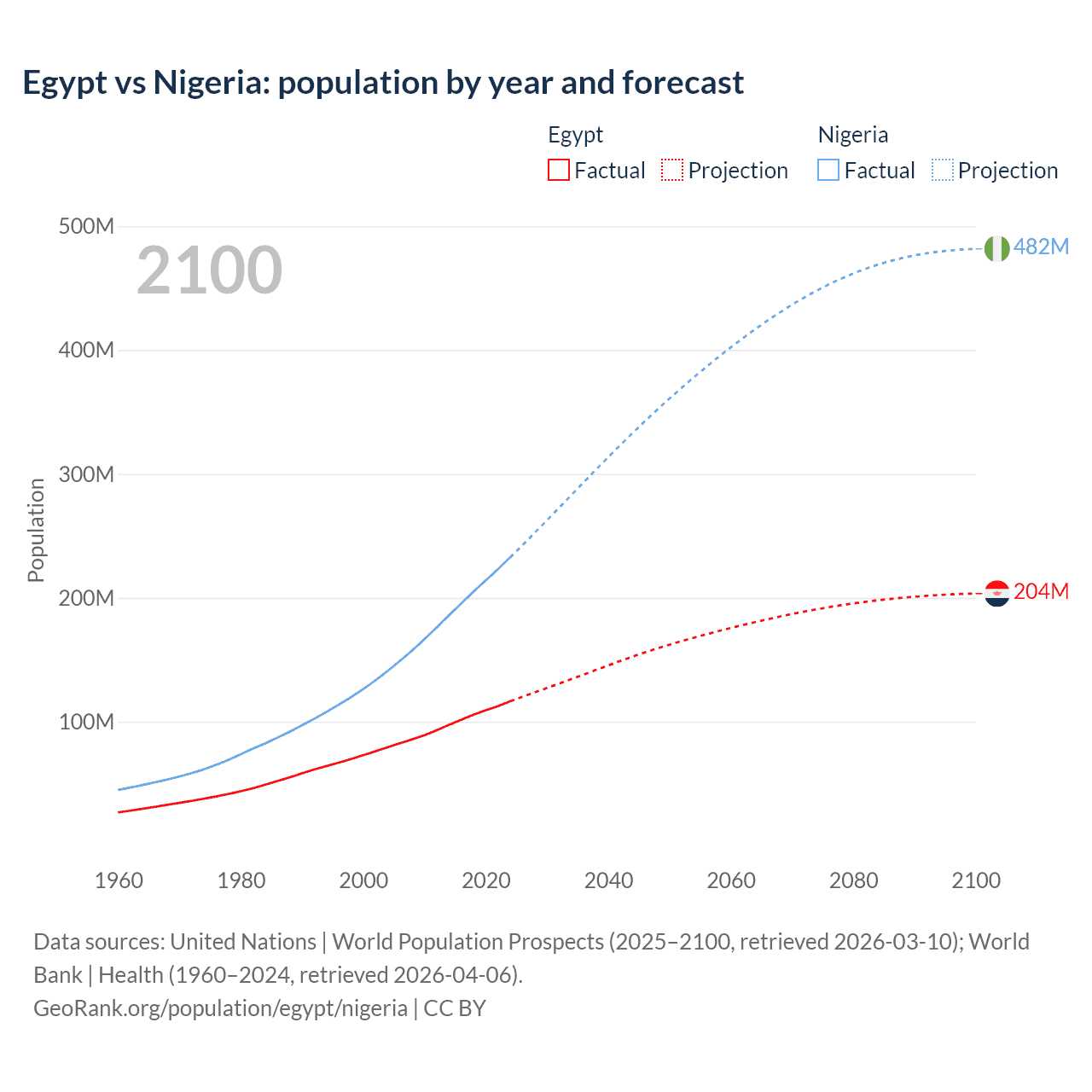 The latest officially reported population of Egypt was 116,538,258 in 2024 vs 232,679,478 people in Nigeria in 2024. In 2026, based on the adjusted UN estimation, the current Egypt's population is 120,697,176 people compared to 243,824,469 in Nigeria.