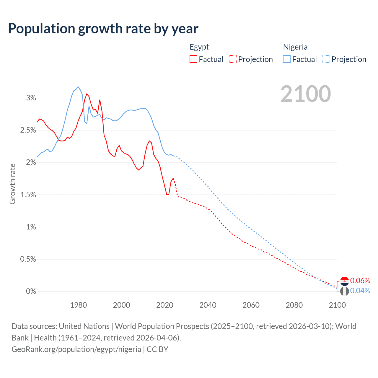 - For the last 10 years, Egypt has had an average growth rate of +1.84% per year vs +2.31% in Nigeria.
