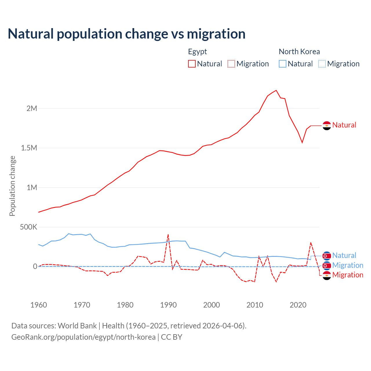 Over the last 10 years, 99.6% of the population change in Egypt is from natural causes (a gain of 19,180,073 people) and 0.41% is from migration (a loss of 78,975 people). In North Korea 97.7% is from natural causes (a gain of 1,097,372 people) and 2.33% is from migration (a loss of 26,227 people).